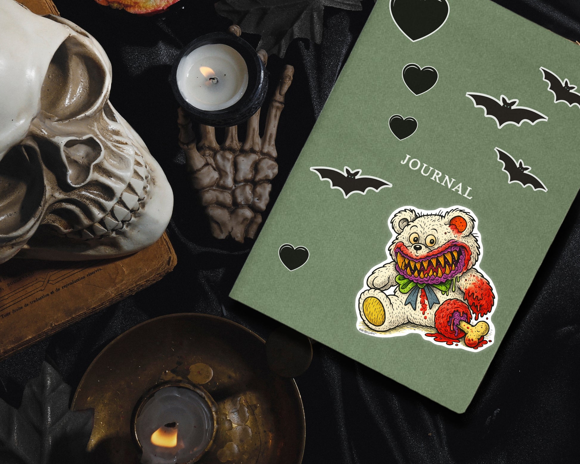 Full transparency: These creepy-cute sticker designs are made using a combo of my original handmade creepy creations and AI-assisted illustration tools.