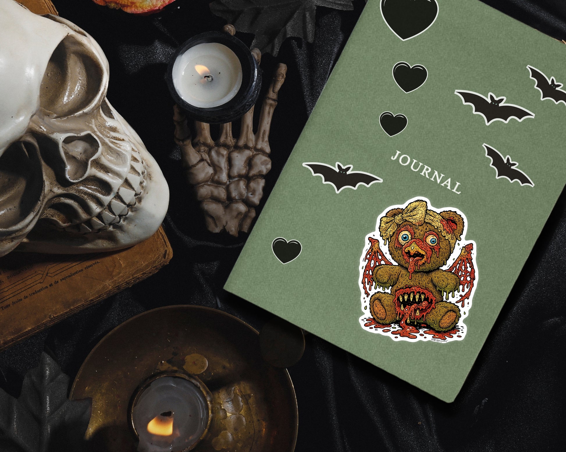 Full transparency: These creepy-cute sticker designs are made using a combo of my original handmade creepy creations and AI-assisted illustration tools.