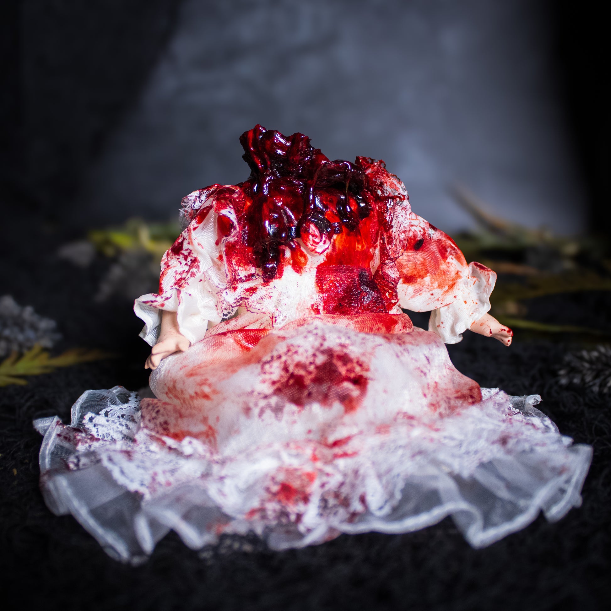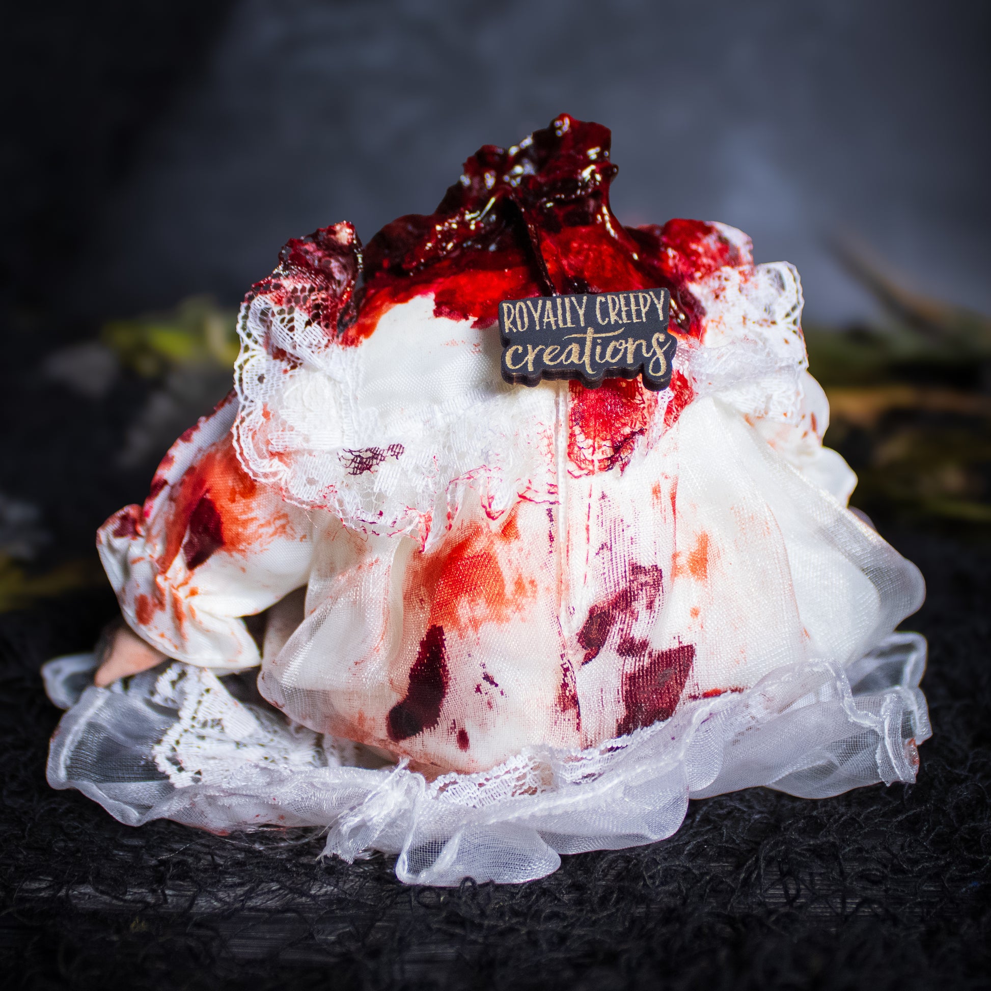 The base material is porcelain with a soft cloth torso. This is a doll that was re-designed and hand crafted into something new by Royally Creepy Creations. This is a one of a kind creation that you can’t get anywhere else. This is intended to be a creepy art piece. Any distressing, cracking, discoloring, etc. are considered intentional and add character and originality to to the art piece.