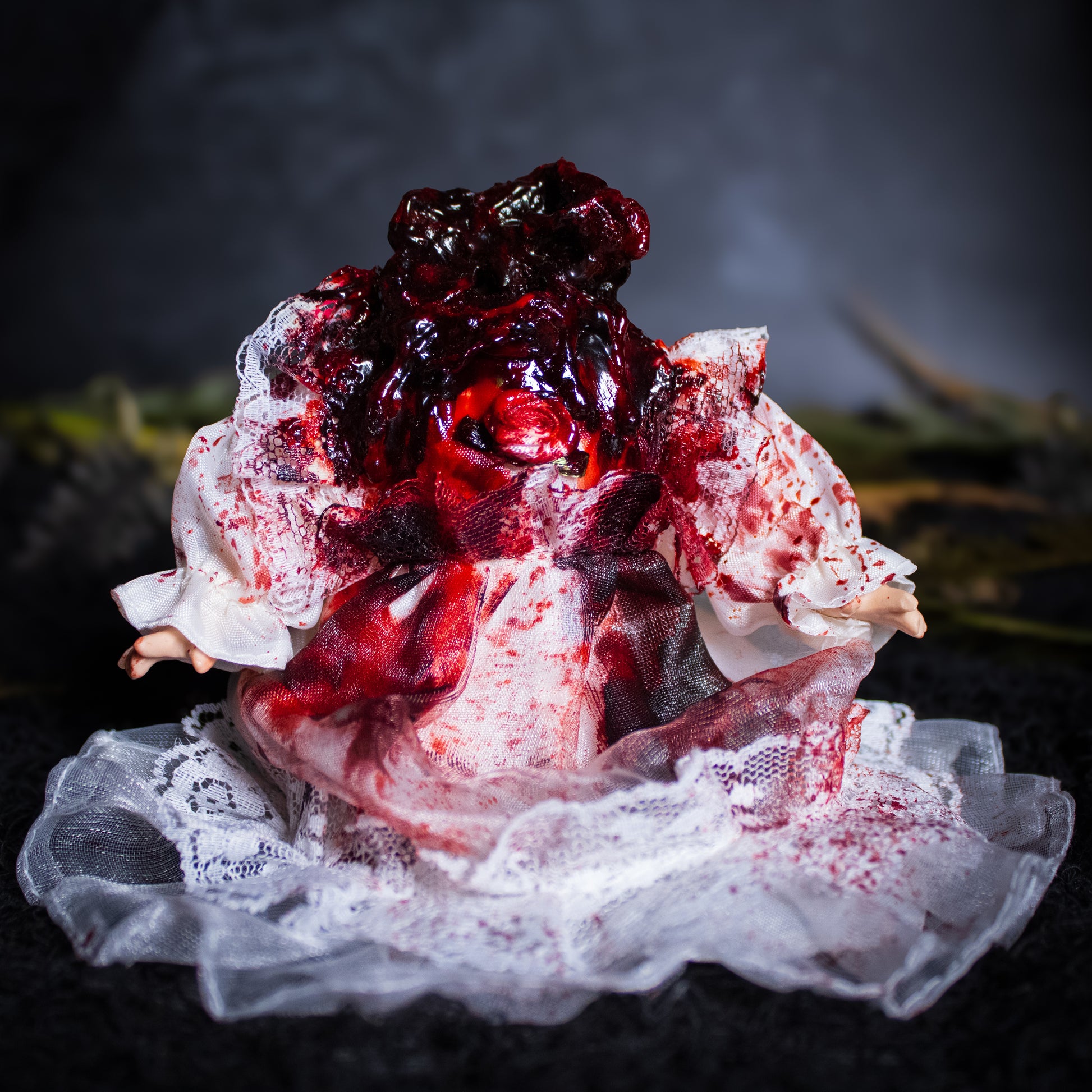 The base material is porcelain with a soft cloth torso. This is a doll that was re-designed and hand crafted into something new by Royally Creepy Creations. This is a one of a kind creation that you can’t get anywhere else. This is intended to be a creepy art piece. Any distressing, cracking, discoloring, etc. are considered intentional and add character and originality to to the art piece.