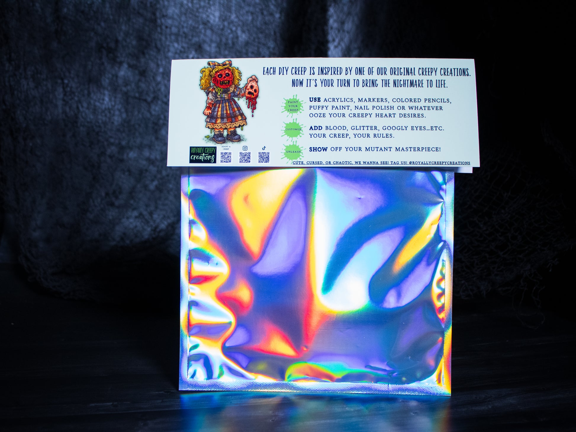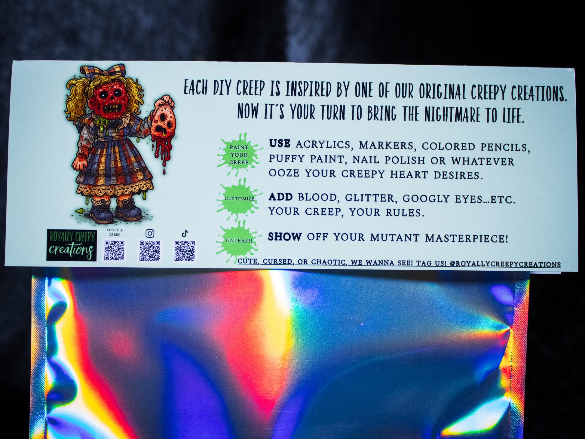 Turn a blank Royally Creepy character into a chaotic masterpiece. Paint it, slime it, glitter-bomb it, whatever your creepy heart desires. Acrylics, markers, puffy paint, nail polish… if it sticks, it works.