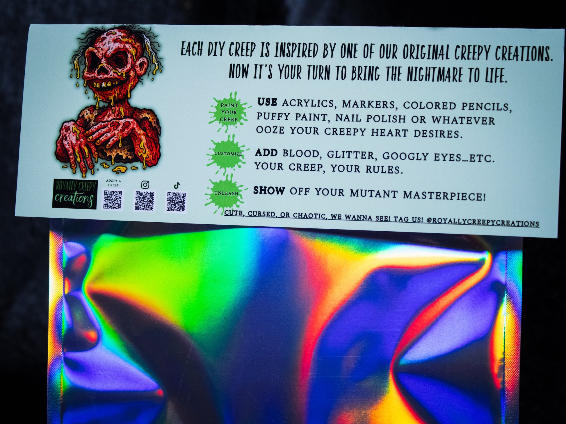Turn a blank Royally Creepy character into a chaotic masterpiece. Paint it, slime it, glitter-bomb it, whatever your creepy heart desires. Acrylics, markers, puffy paint, nail polish… if it sticks, it works.
