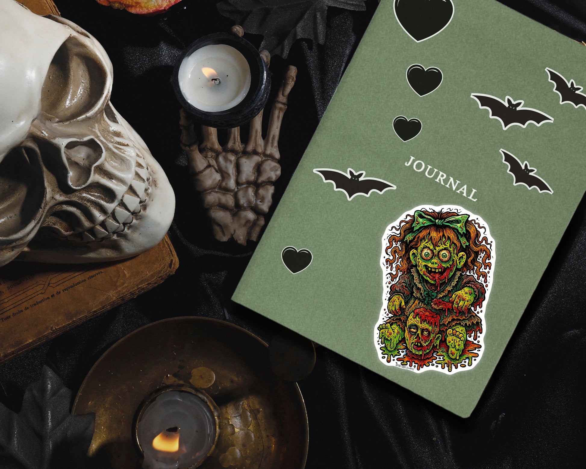 Full transparency: These creepy-cute sticker designs are made using a combo of my original handmade creepy creations and AI-assisted illustration tools.
